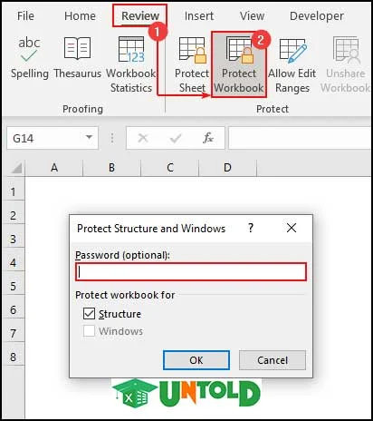 Like a dialog box for a group of commands, a command may also pop up a dialog box with more options when the command is clicked. These types of commands can’t work until you provide further information through the dialog box. For example, if you choose Review ➪ Changes ➪ Protect Workbook. Excel can’t carry out the command until you provide the password in the ‘Protect Structure and Windows dialog box.